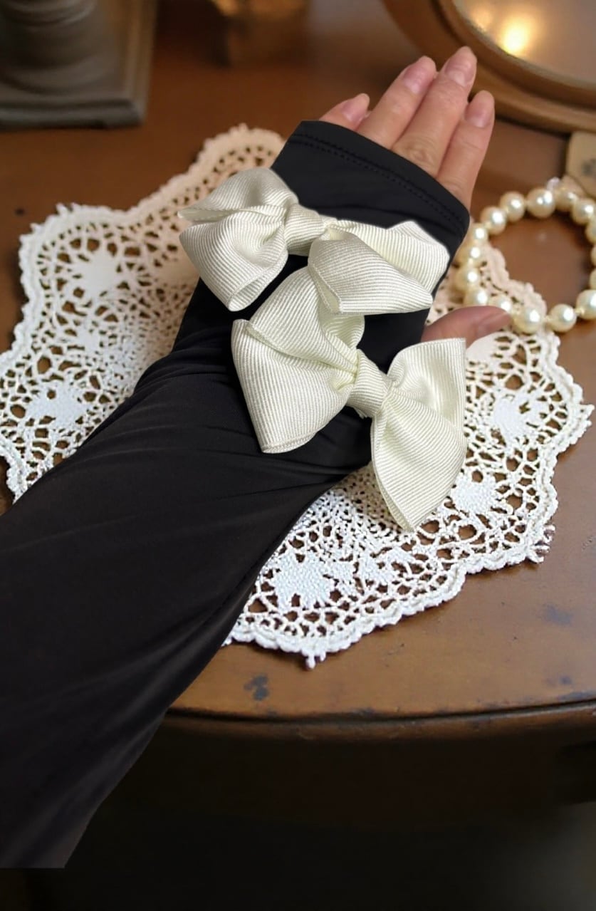 ちょうど肘上ぐらいまでの長さ45センチでとても使いやすい長さです。とにかく可愛いリボンが2つずつあしらわれています。 まだまだ紫外線が強い季節、UV加工の手袋はいかがでしょうか。